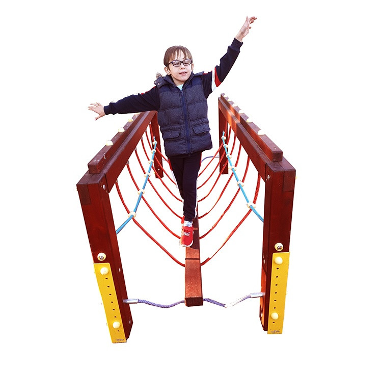 Termékjellemzők: Közterületi játszóterekre, óvodákba, iskolákba, kisgyermekek részére ajánlott egyensúlyozó, ügyességfejlesztő játékszer. Az eszköz 3 fő elemből áll, két tartóváz és egy 16 mm-es drótkötélbetétes kötélhálón függő lengő gerendából.