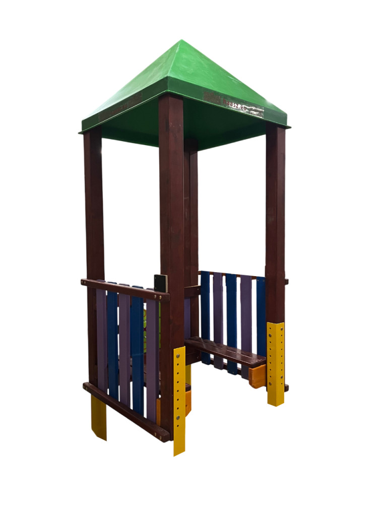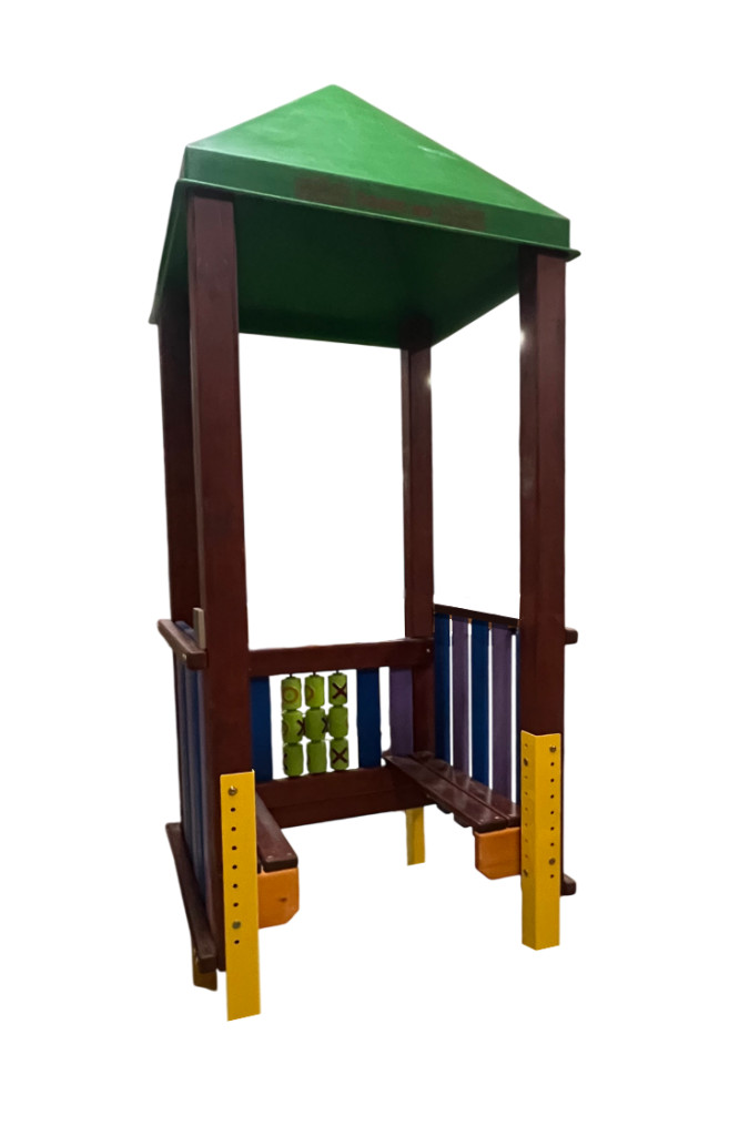 A házikó két szemközti belső oldalán pad került elhelyezésre, a hátsó oldalfalban került rögzítésre a 9 műanyag forgatható hengerből álló OXO játék.