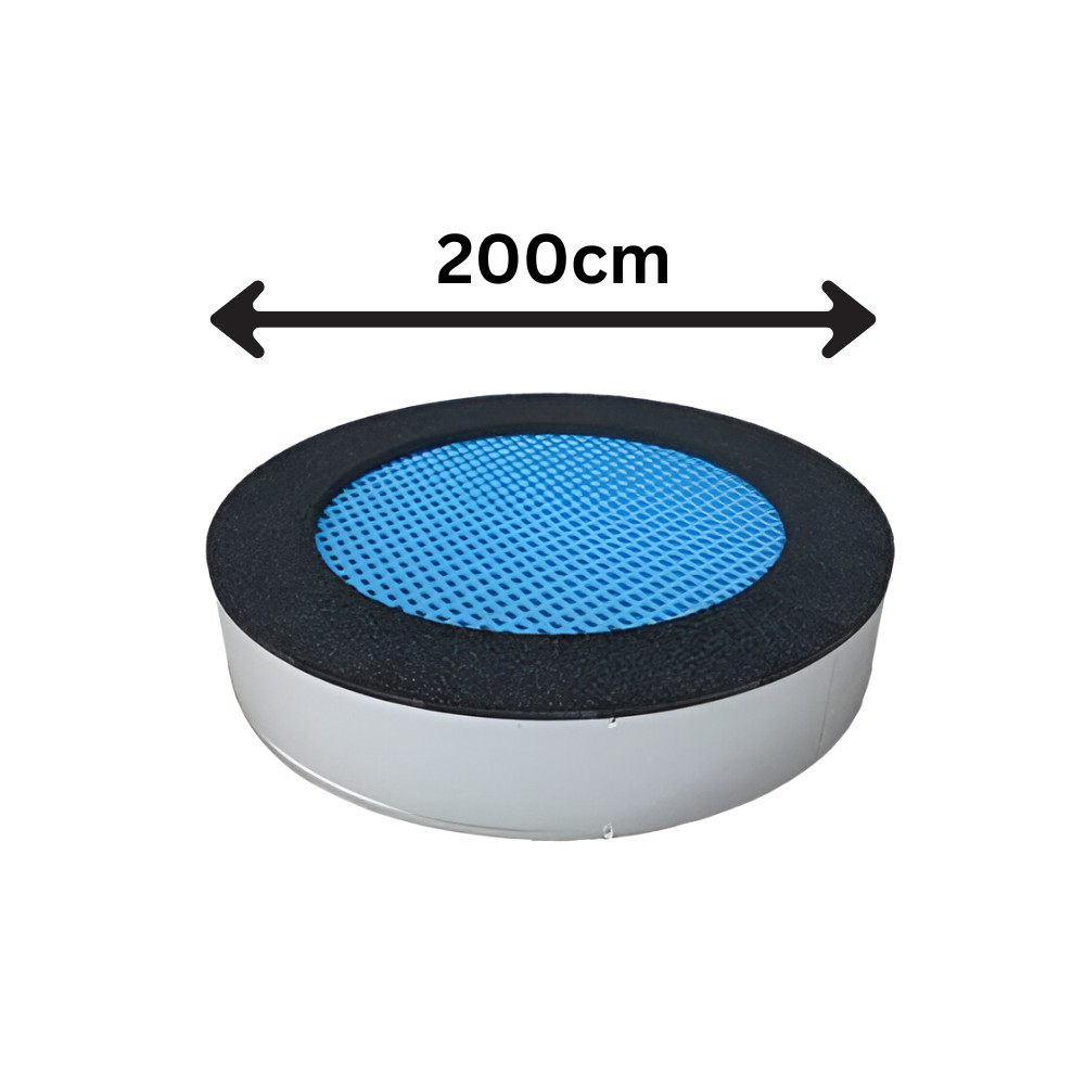 The edges of the jumping mat are covered with a 40 mm thick EPDM/SBR rubber border, bonded to the frame with a polyurethane-based adhesive.